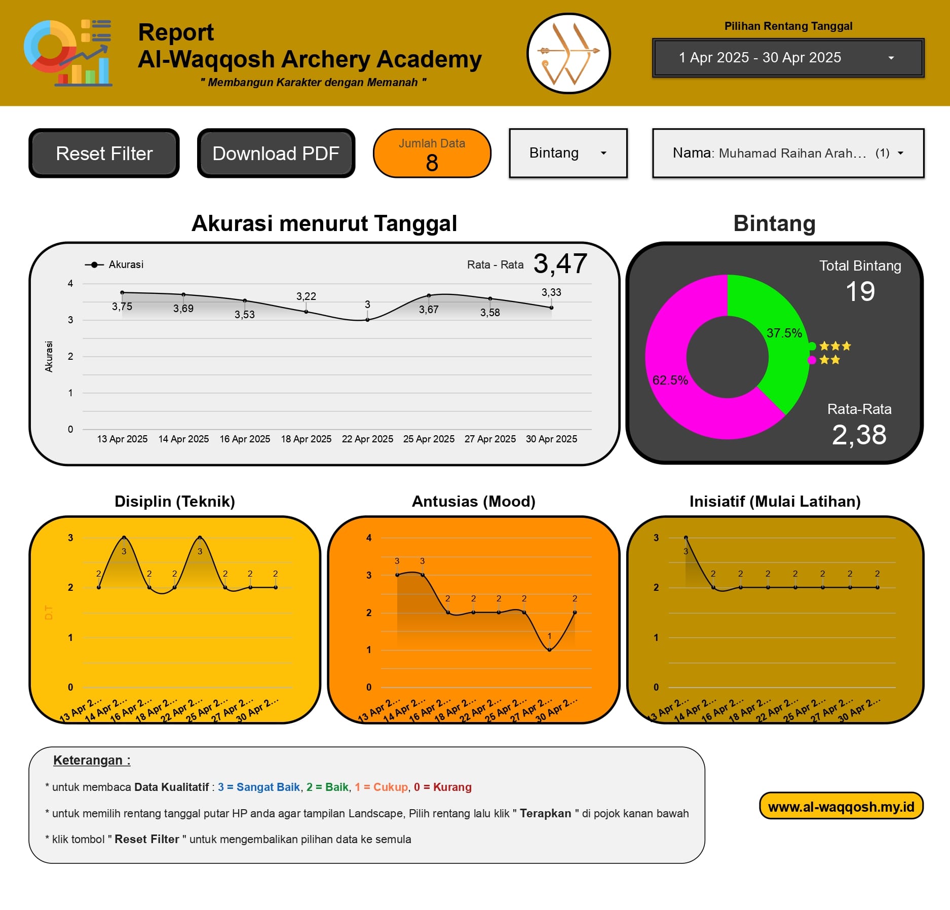 Fokus, disiplin, berani, percaya diri, tegas, terampil, kompetitif dan prestasi, bukan tujuan akhir dari pelatihan di akademi. Tujuan akhir dari akademi ini adalah keridloan Allah SWT dengan wasilah membumikan salah satu sunnah Rasulullah SAW yaitu memanah.